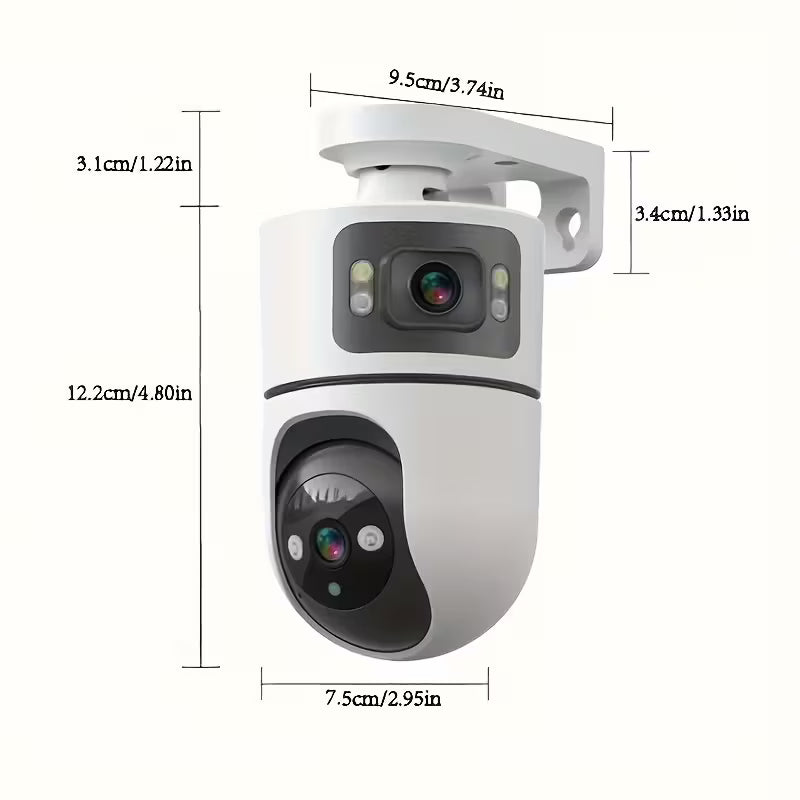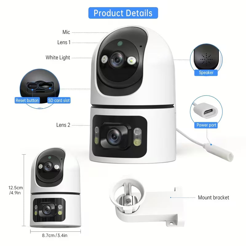 Snjöll öryggismyndavél með tvöfaldri linsu, litanætursjón, AI hreyfiskynjun, PTZ halla- og snúningsaðdrátt, hljóð- og ljósviðvaranir, 2,4 GHz WiFi þráðlaust, fjölnota deiling, fjölskjái, appviðvaranir, Micro SD/skýjageymsla, USB knúin, heimilisöryggi